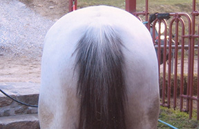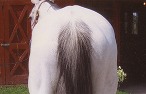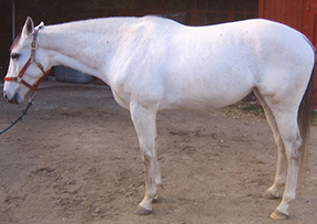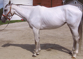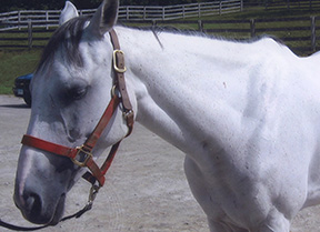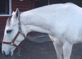 White Magic is a 10-year-old TB jumper in New York State. The owner went thru a gamut of treatments with veterinarians, chiropractors, and acupuncturists and could not find a solution. The horse was very underweight even though feeding and care was more than adequate. In this photo you can see the shortened neck, muscling at 50%, compressed topline, and elevated at the low back.